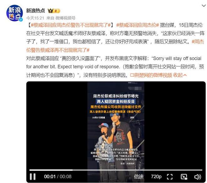 面对周杰伦的喊话,蔡威泽也回应了,他说他的确很久没露面了,他会暂时离开社交网站一段时间,在这段时间内预计也不会回复信息。