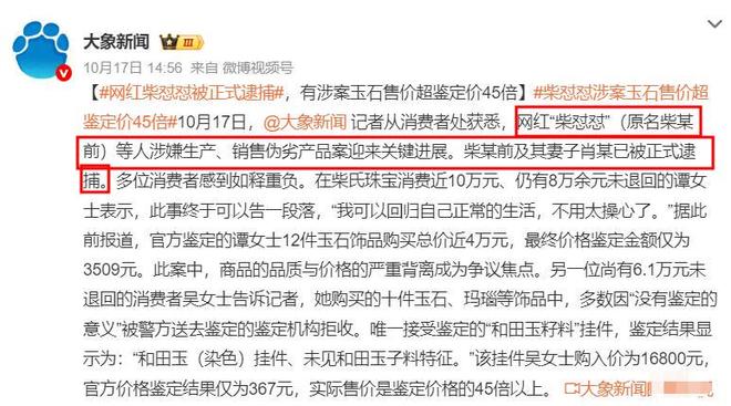 如今柴怼怼彻底栽了,10月17日,柴怼怼被正式逮捕的消息登上了热搜。