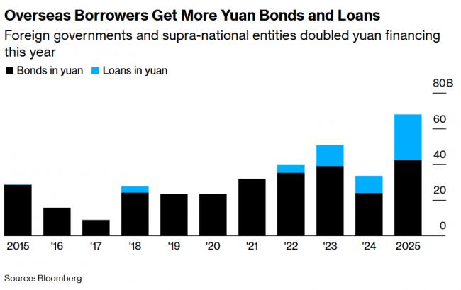据彭博汇编数据,截至2025年10月,各国政府、政策性银行及国际机构已发行合计680亿元人民币(约95亿美元)的人民币债券与贷款,是2024年全年总量的两倍。