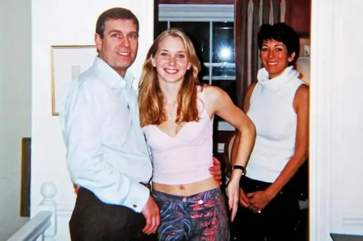 安德鲁王子在左侧,手臂搂着弗吉尼亚·罗伯茨·朱弗雷的腰;吉斯莱恩·麦克斯韦在右侧,靠在门框上。