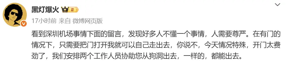 26日晚,脫口秀演員黑燈發文稱:“看到深圳機場事情下面的留言,發現好多人不懂一個事情,人需要尊嚴。在有門的情況下,只需要把門打開我就可以自己走出去,你說不,今天情況特殊,開門太費勁了,我們安排兩個工作人員協助您從狗洞出去,一樣的,都能出去。 ”