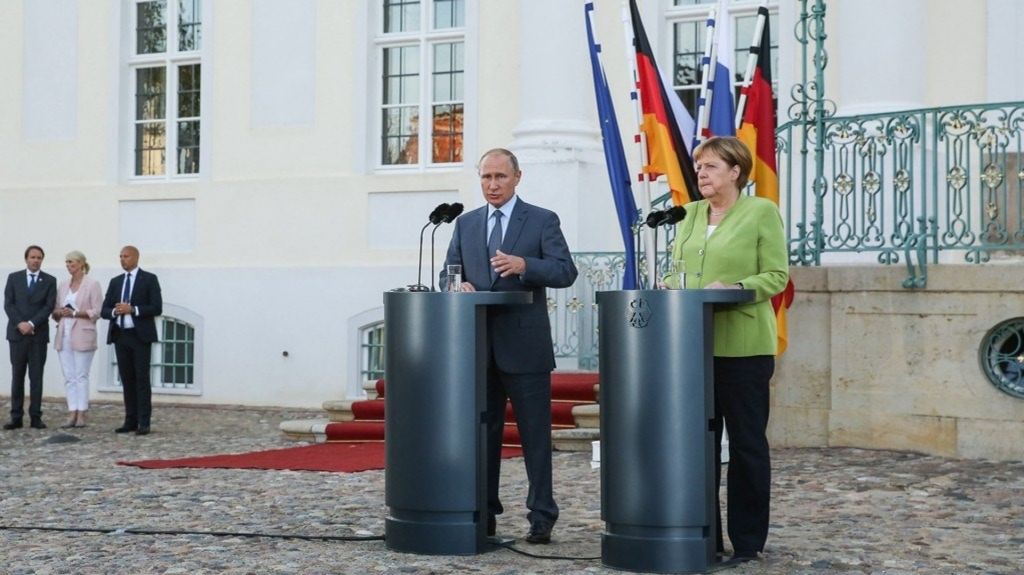 俄罗斯总统普京(图左)(Vladimir Putin)曾多次访问德国,与德国总理默克尔(Angela Merkel)就「北溪2号」天然气管道项目等问题进行讨论。(新华社)
