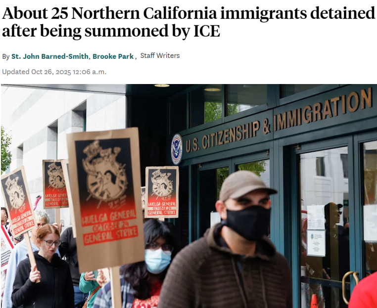 周六(10月25日)下午,约25名无证移民在加州斯托克顿(Stockton)的美国移民与海关执法局(ICE)办事处报到时被拘留。