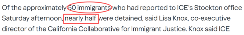 加州移民司法协作组织(CCIJ)的联合执行董事丽莎·诺克斯(Lisa Knox)表示,当天下午大约有50名移民到斯托克顿ICE办事处报到,其中有近一半被拘留。