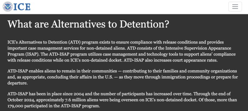 该机构在其网站上表示:“‘替代拘留/强化监管出庭计划’(ATD-ISAP)允许移民留在自己的社区——为家庭和社区组织做出贡献,并在适当情况下处理在美事务——同时在移民程序中进行案件审理或为离境做准备。”