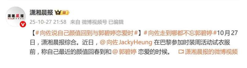 向佐在巴黎时装周试衣时的一番“颜值宣言”,成功吸引了全网注意。这位向来以硬汉形象示人的男星,对着镜头自信表示,自己最近的颜值状态已“回春”到2019年和郭碧婷热恋时的巅峰水平,还顺势秀了把“陪碧婷选婚纱”的回忆杀,被网友调侃“走到哪都不忘撒糖”。