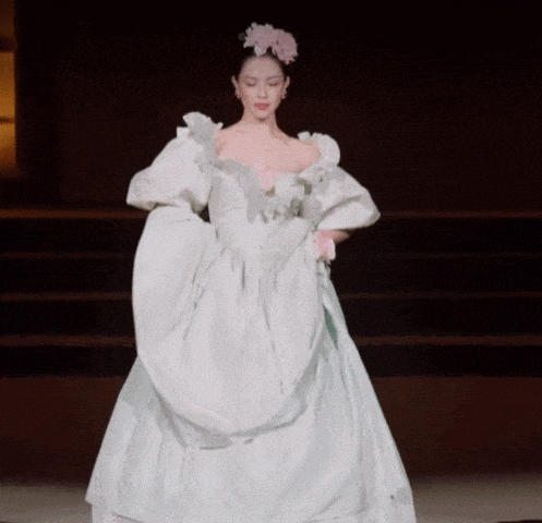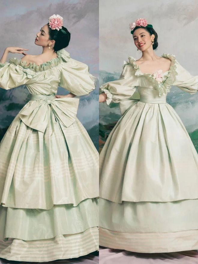 钟楚曦上身Nina Ricci 1987高定系列薄荷绿宫廷裙,搭配牡丹发饰与花朵装饰鞋, 宛如从1 9世纪油画 中走出的古典美人 。
