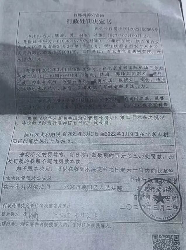 陈海等人因寻衅滋事被北京警方行政拘留。受访者供图