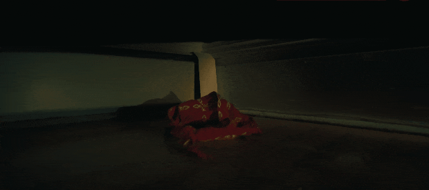 並且指引印第爬上二樓,在衣櫃底下發現一條紅色的圍巾,正是系在班迪特脖子上的那一條。