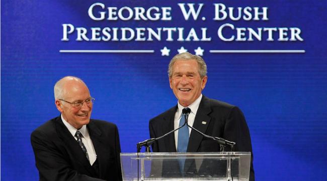 2010年11月16日,在美国德州达拉斯(Dallas)举行的小布殊(George W. Bush,右)总统中心奠基仪式上,美国前副总统切尼(Dick Cheney,左)向公众介绍小布殊。(Getty)