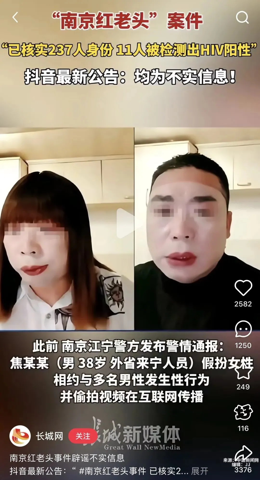 在南京江寧區,一名38歲的“外省來寧人員”焦某某通過戴假發、抹口紅、穿裙子假扮女性,以“紅姐”(真相揭穿後,網友戲稱其為“紅老頭”“紅大爺”)身份在網絡活動,以“免費服務”為誘餌,要求上門者不能空手,必須攜帶食用油、牛奶等日常物品作為“禮物”,進而偷拍大量親密視頻