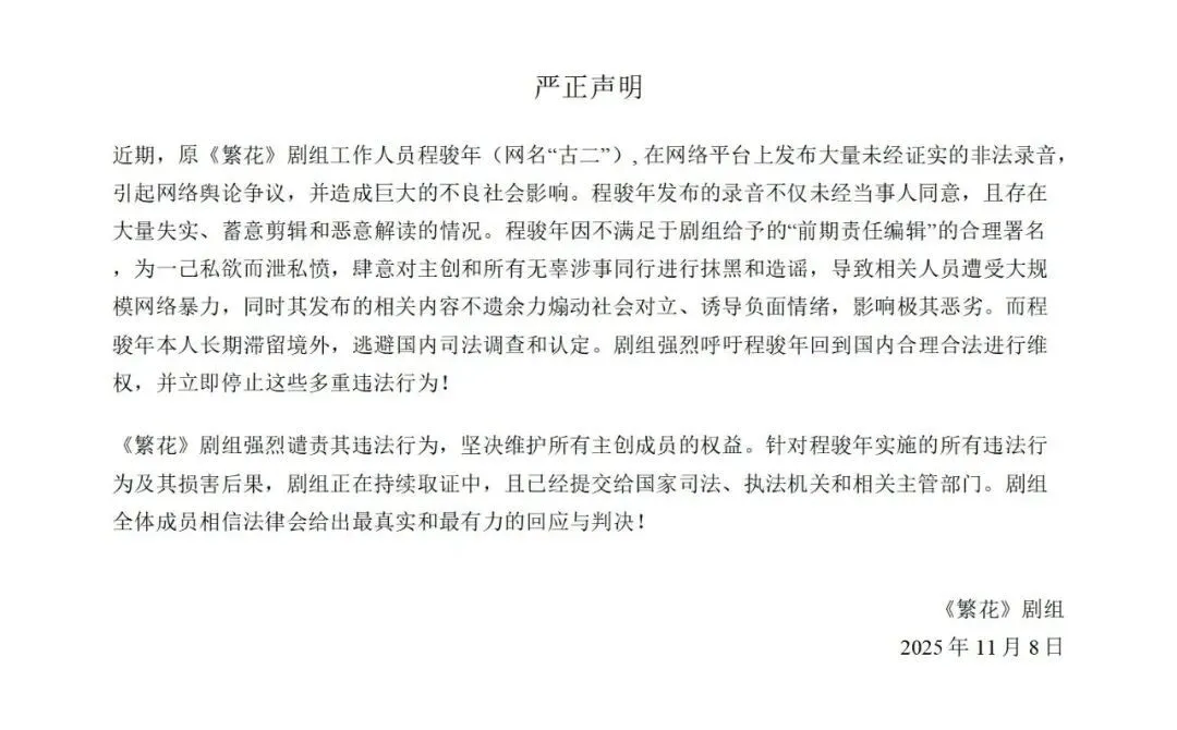 而《繁花》劇組則發布聲明,稱古二發布大量未經證實的非法錄音,不僅未經當事人同意,且存在大量失實、蓄意剪輯和惡意解讀的情況。強烈呼吁其“立即停止這些多重違法行為”。