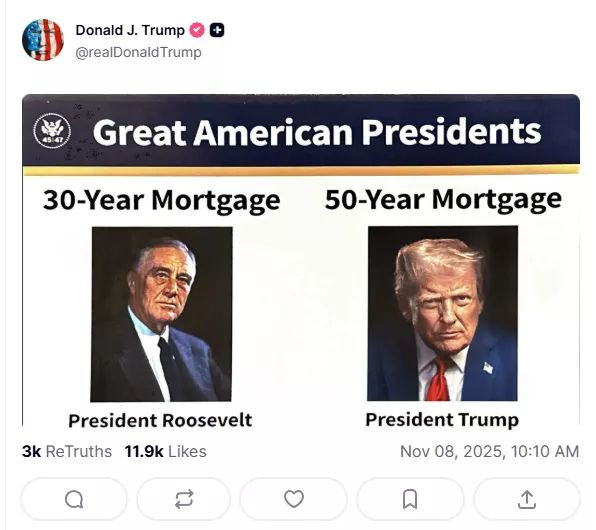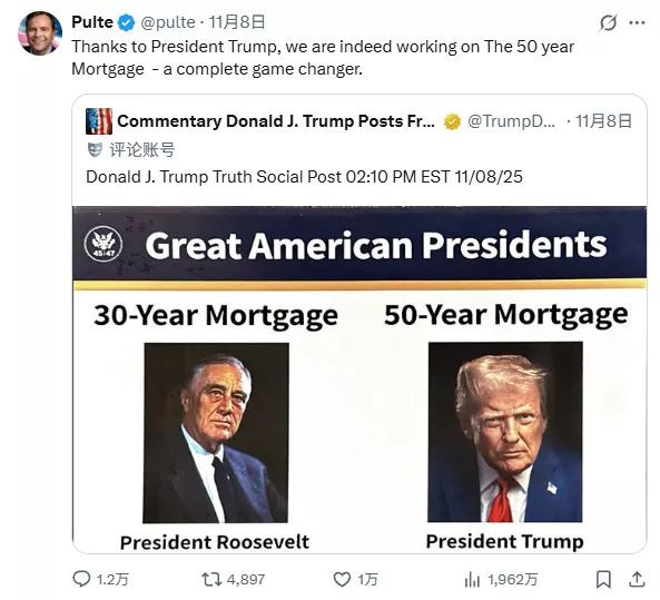 很快,聯邦住房金融局(FHFA)局長比爾·普爾特(Bill Pulte)就在社交媒體X轉發了川普的截圖,並說:“感謝川普總統,我們確實正在努力實現50年抵押貸款——這將徹底改變游戲規則。”
