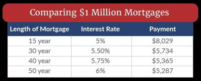 這其實很容易理解。假設15年期固定利率抵押貸款的利率為5%,30年期利率為5.5%,40年期利率為5.75%,50年期利率為6%。那麼,同樣是100萬美元的抵押貸款,如果30年貸款,每個月要支付5734美元,如果是50年貸款,每個月支付5287美元,減少了近500美元。