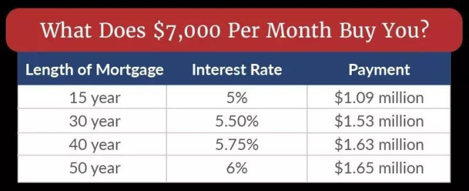 反過來推算,你會發現,如果選擇更長的貸款期限,同樣的首付,就能買到更貴的房子。假設某人首付20%,每月有7000美元用於償還本金和利息。那麼,他能買到多貴的房子?