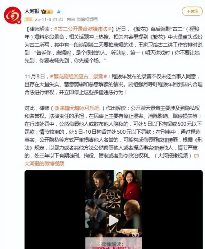 《繁花》剧组11月8日发布声明,称录音是“非法偷录+恶意剪辑”,还透露古二“长期滞留境外,逃避司法调查”。 剧组在声明里喊话,希望古二回国,通过合法途径维权。