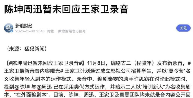 11月8日,古二再曝新录音,这次牵扯出更大黑幕。 王家卫提议开办“编剧夏令营”,专门招收学生,美其名曰培训,实则是为了搜集年轻人写的剧本。