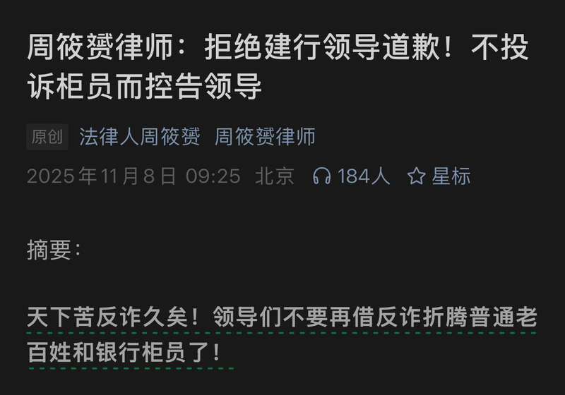 周筱赟拒绝接受该道歉,他解释道,“建行东营分行称体验不佳,系认为我作为储户太敏感,或认为柜员理解有误、态度不好,将责任推给了我或柜员。但实际上,错的是建行的管理层。”