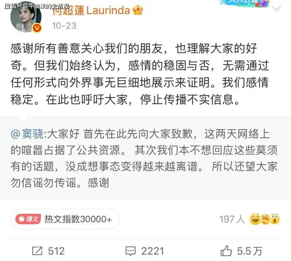 向太就差没报何超莲窦骁的身份证号码了,何超莲窦骁都没有回应,直到谣言愈演愈烈,他们才声明并没有离婚,但网友们似乎有了免疫力,根本不信。