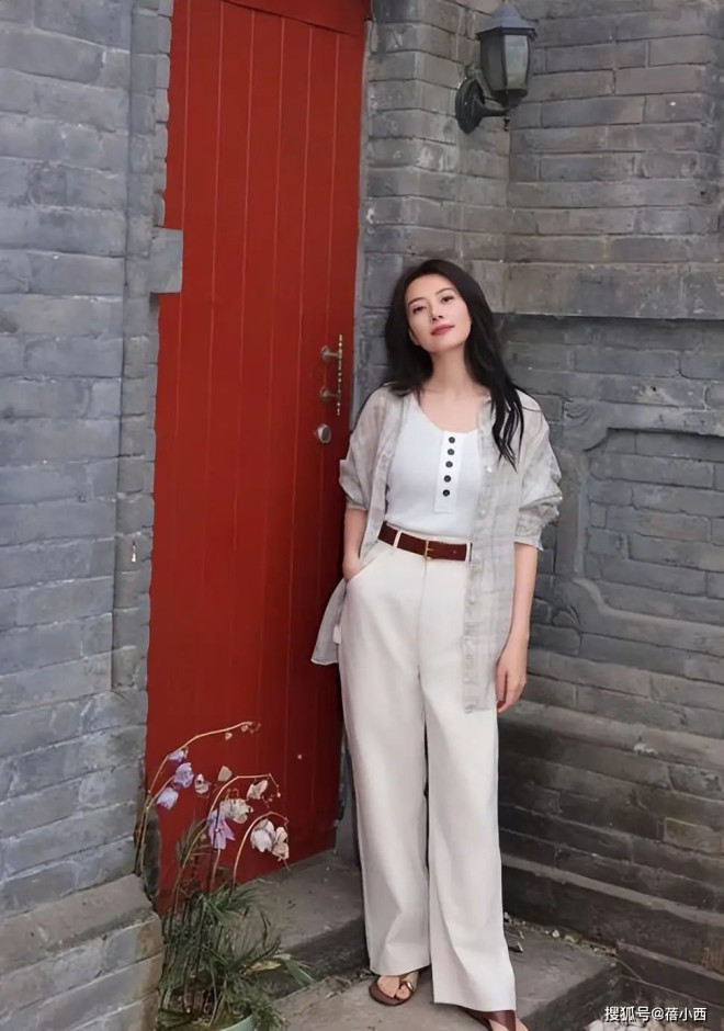 格紋襯衫也是很百搭的單品,高圓圓把它敞開穿,裡面配米白內搭,下裝是闊腿褲,看起來簡約還大氣。更妙的是,高圓圓她加了條棕色皮帶,瞬間把“松垮”變成了“松弛”,闊腿褲的垂墜感又遮了腿型,特別顯瘦,平時逛街都可以這樣打扮,舒適還時髦。