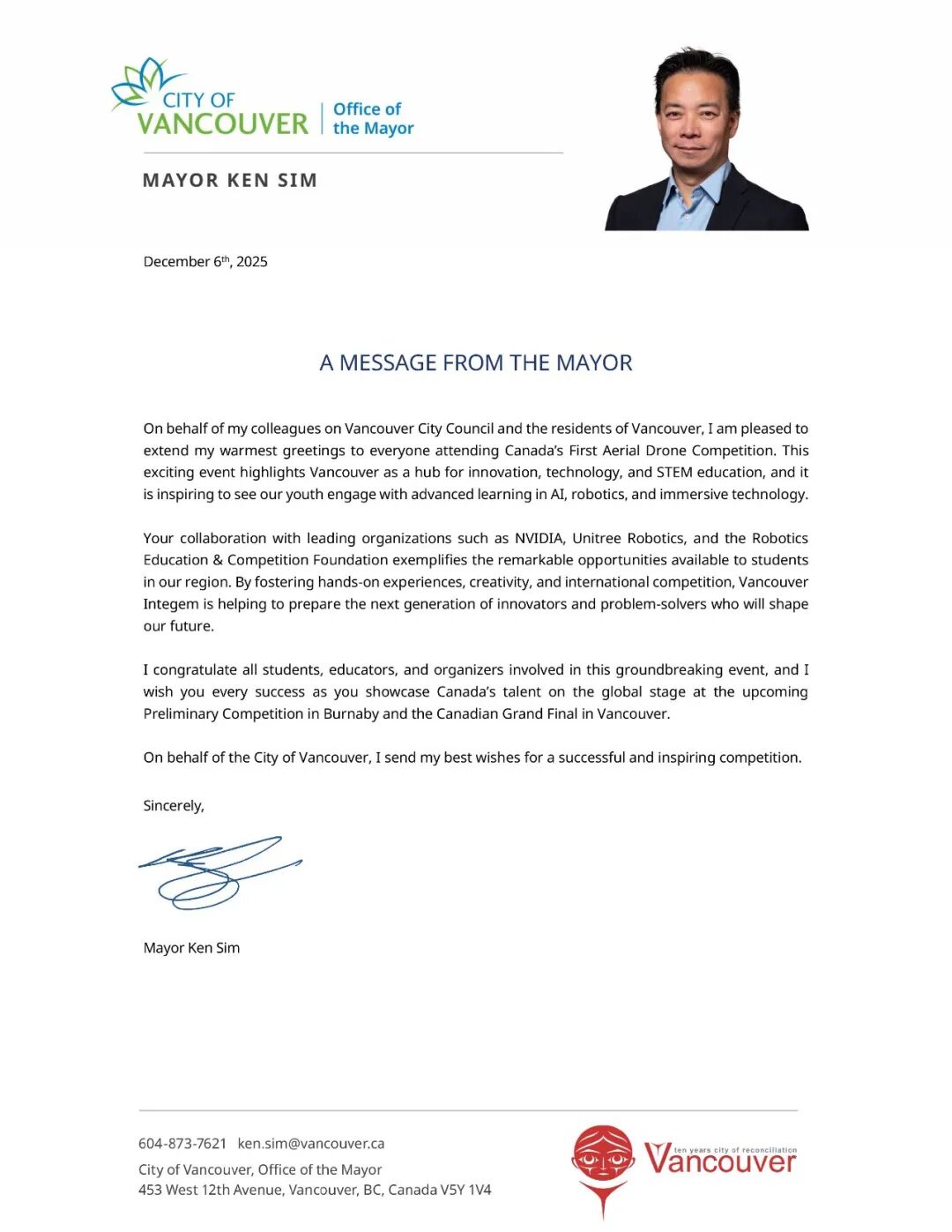 本拿比市议员王白进先生代表本拿比城市致以诚挚祝福,他指出赛事不仅是无人机与AI的比拼,更是展示教育成果与青年领导力的平台。他感谢主办方与赞助商的支持,并祝愿活动圆满成功。