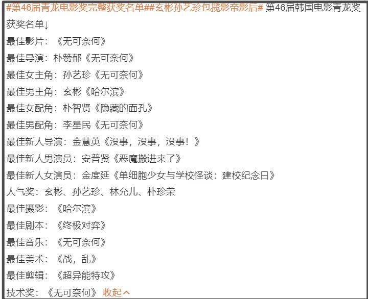 孫藝珍憑借電影《無可奈何》實現影後雙滿貫,《無可奈何》還拿到了最佳影片、最佳導演、最佳音樂、最佳技術和最佳男配角獎項。