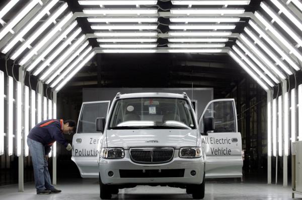 中國天津市的天津清源電動車輛有限責任公司的工廠裡,一名員工正在檢查即將出口的電動汽車。/韓聯社