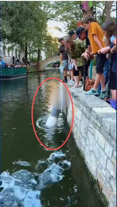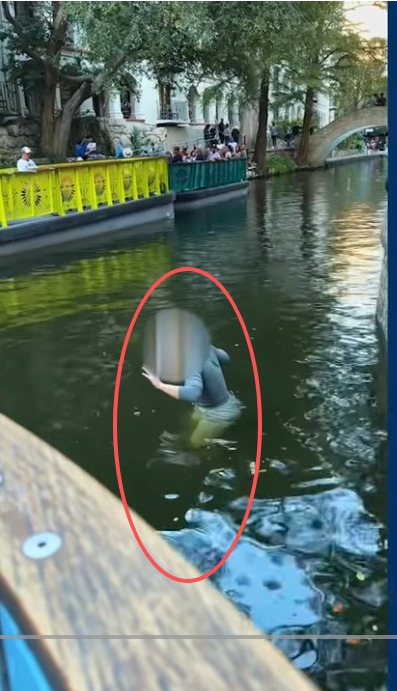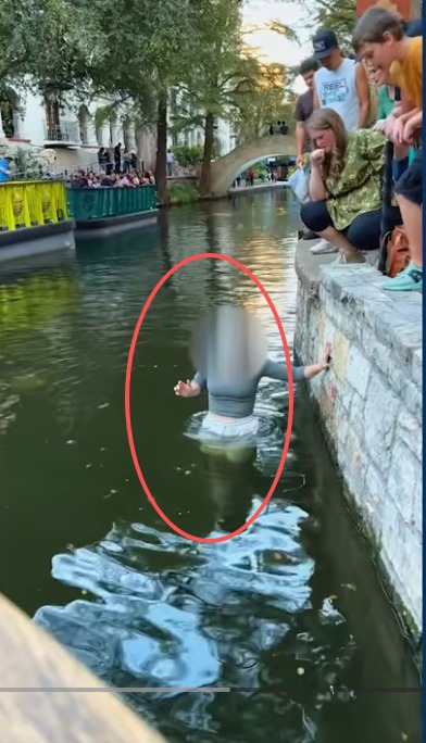 (加西網綜合)一段顯示一名女子在德州聖安東尼奧著名景點——聖安東尼奧河道步道(River Walk)水中試圖找回掉入河裡的手機的視頻在社交平台走紅。