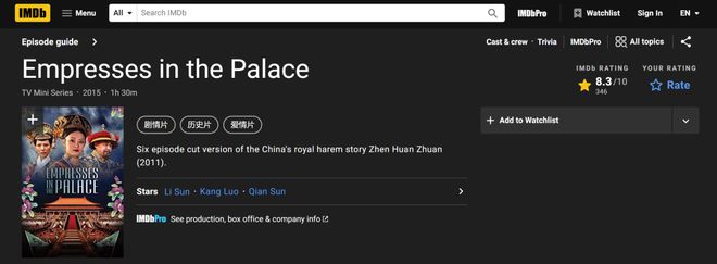 ǰ¼¸Ä꣬ËüµÄ°æÈ¨±» Netflix Âò×ߣ¬³öÁËÒ»¸öÃÀ°æ¡¶Õç‹Ö´«¡·£¨Empresses in the Palace£©£¬¾­¹ýÃÀ·½´óµ¶À«¸«µØ¼ô¼­ºÍɾ¸Äºó£¬Ñ¹Ëõ³É6¼¯µÄÃÔÄã¾ç£¬Ã¿¼¯90·ÖÖÓ¡£