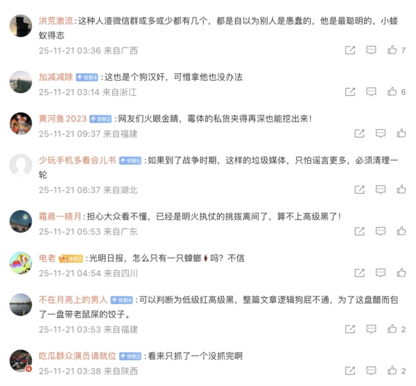 “可以判断为低级红高级黑,整篇文章逻辑狗屁不通,为了这盘醋而包了一盘带老鼠屎的饺子”“这明显是高级黑。建议直接判刑”“高级黑,别以为大家看出不来”“居心叵测,包藏祸心”“写这些稿子的人是高级黑还是思维仍然停留在上个世纪?”
