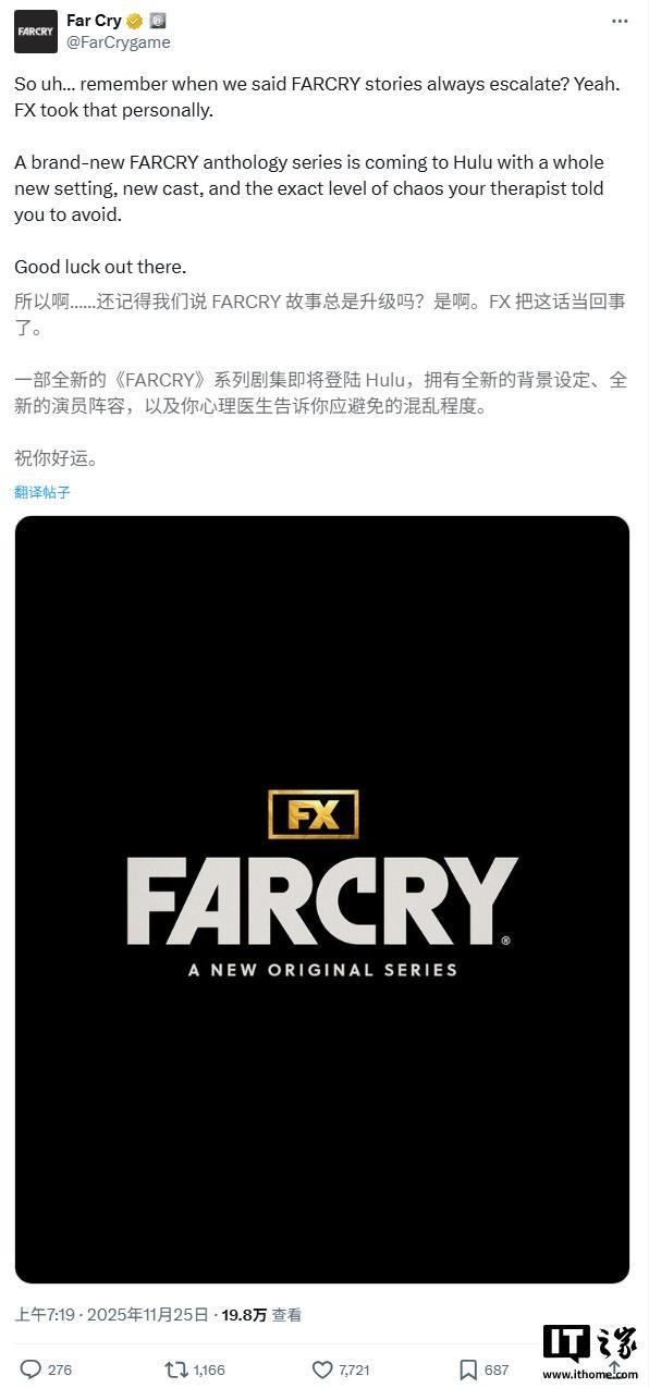 IT之家 11 月 25 日消息,育碧、FX 宣布將推出一部全新的《孤島驚魂》改編真人劇,由 Noah Hawley 與 Rob Mac(原名 McElhenney)共同開發,且 Mac 還將出演該劇。