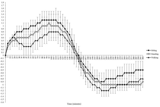 下图是在一项研究中溜达和站立 2 分钟对血糖相关指标的影响对比: