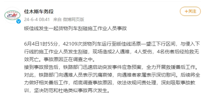 2024年6月4日,黑龙江绥佳线一列货车撞死6名施工人员。