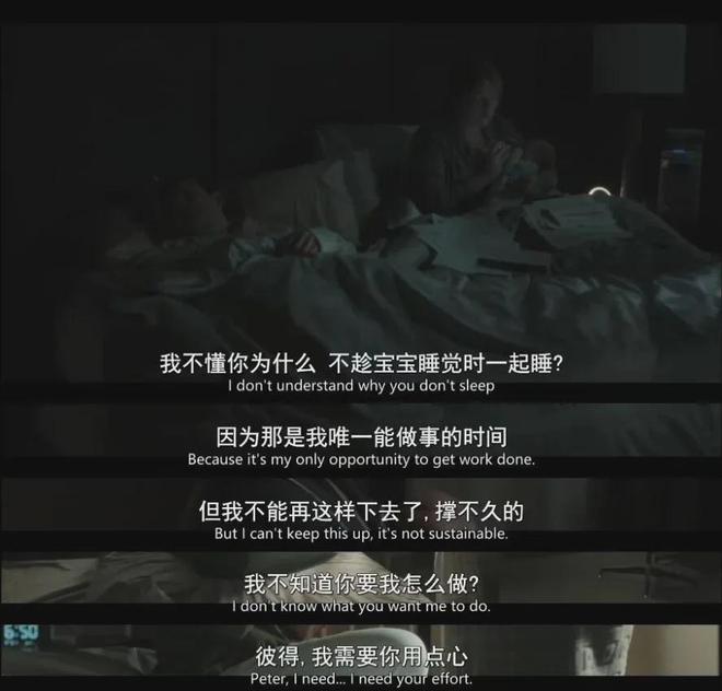 当玛丽莎被育儿问题逼到精神崩溃时,彼得很真诚地说:“你只要告诉我怎么做,我就照做。” 可紧接着镜头里还是玛丽莎在阅读《了解宝宝的睡眠》,而彼得却在刷搞笑视频