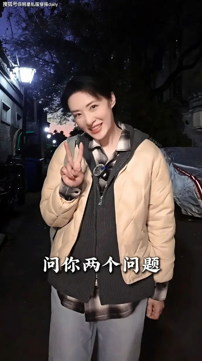 57歲周濤帶火"知性疊穿":棉服+格紋衫+連帽衫