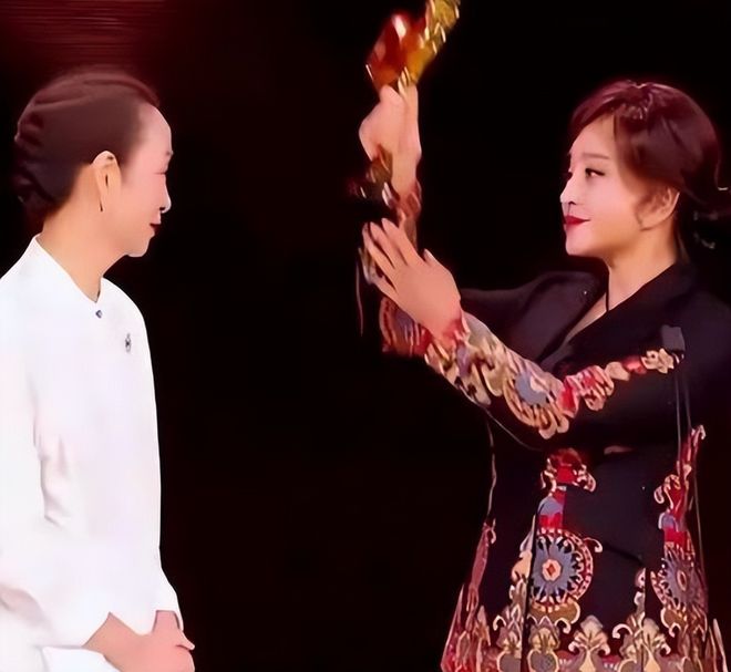 2022年金鸡奖颁奖礼上的一幕令人寻味: 当奚美娟凭借电影获得最佳女主角时,颁奖嘉宾刘晓庆单手攥着奖杯,高高举起然后再给她。