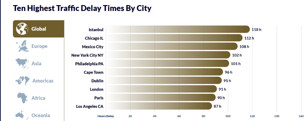 土耳其伊斯坦布爾位居全球第一,司機因擁堵平均損失 118 小時;芝加哥緊隨其後,為 112 小時;墨西哥城位列第三,司機平均損失 108 小時。