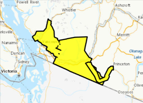 警告称,大温地区的北岸和高贵林-枫树岭地区,以及菲沙河谷、豪湾和沿3号公路至普林斯顿的内陆地区预计将出现强降雨。