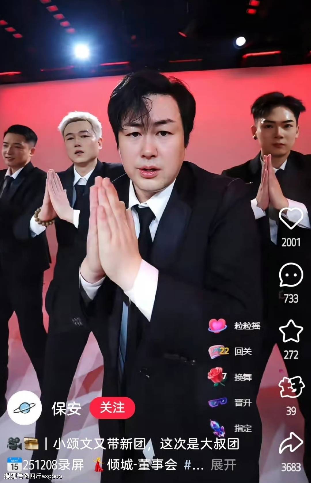再看“小頌文”本人,三七分背頭梳得一絲不苟,黑色西裝一穿。