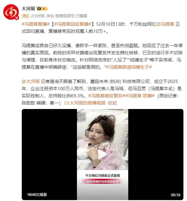 冯提莫坦言自己好久没播,像新手一样紧张,甚至热泪盈眶。她回应了过去一年停播的真实原因。前段时间她的甲状腺癌出现复发并发生病灶转移,已及时进行手术切除与清理,目前身体状态稳定。针对网络流传的“人没了”“结婚生子”等不实传闻,冯提莫在直播中明确辟谣:“这些都是假的。”