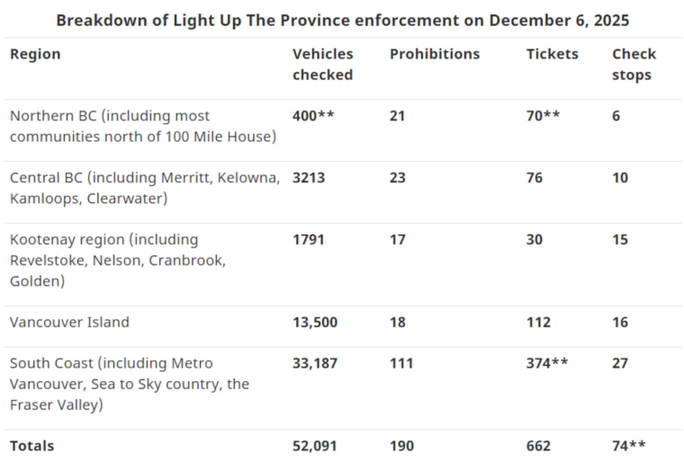 BC省高速巡逻队(B.C. Highway Patrol,BCHP)今天公布了2025年12月6日该行动的执行结果。在那天夜里执法人员检查了 52,091 辆车,开出了 190 张路边立即禁止驾驶罚单和 662 张罚单。