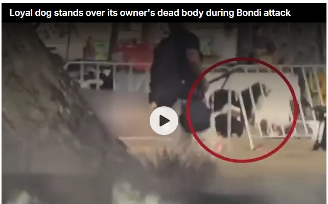 一段令人心碎的視頻顯示,在周日晚上邦迪海灘光明節活動上,當槍手薩吉德·阿克拉姆(Sajid Akram)開槍時,一只忠誠的狗守在主人的屍體旁。