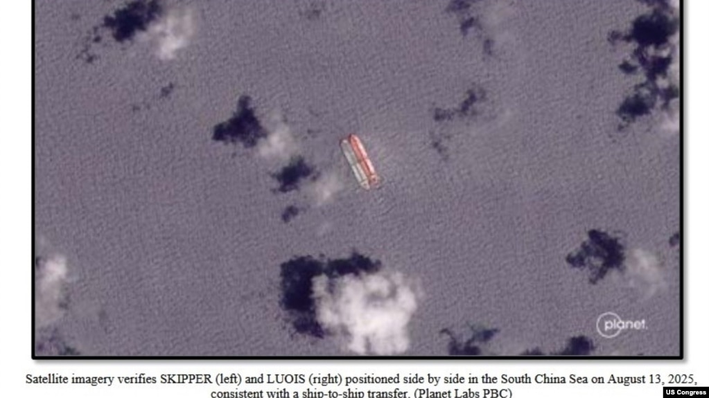 美国众议院中国问题特设委员会主席穆勒纳尔在2025年12月12日写给财政部长贝森特的信中提供源自Planet Lab PBC的卫星图像,证明两艘油轮SKIPPER号(左)与LUOIS号(右)2025年8月13日在南中国海并排行驶,与船对船转运相符。