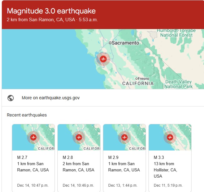 USGS數據顯示,自12月13日至15日,聖拉蒙地區已先後發生多次地震,包括12月13日的2.9級、2.3級和2.2級地震,12月14日的2.8級地震,以及12月15日的2.4級和2.1級地震,同時還伴隨著數十次更小的余震。