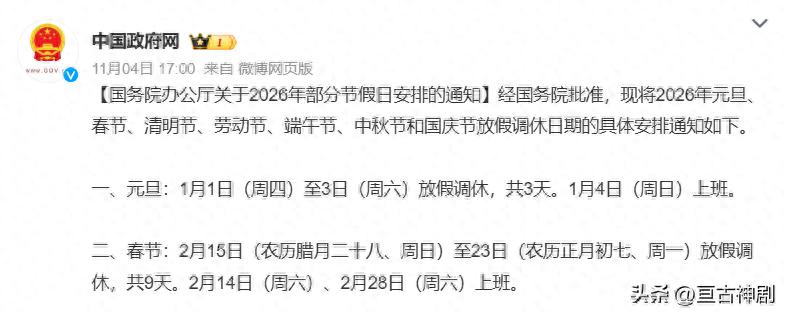 11月4日,大家终于盼来了2026年部分节假日的安排通知,并且官宣了春节共有9天假,算是史上最长。