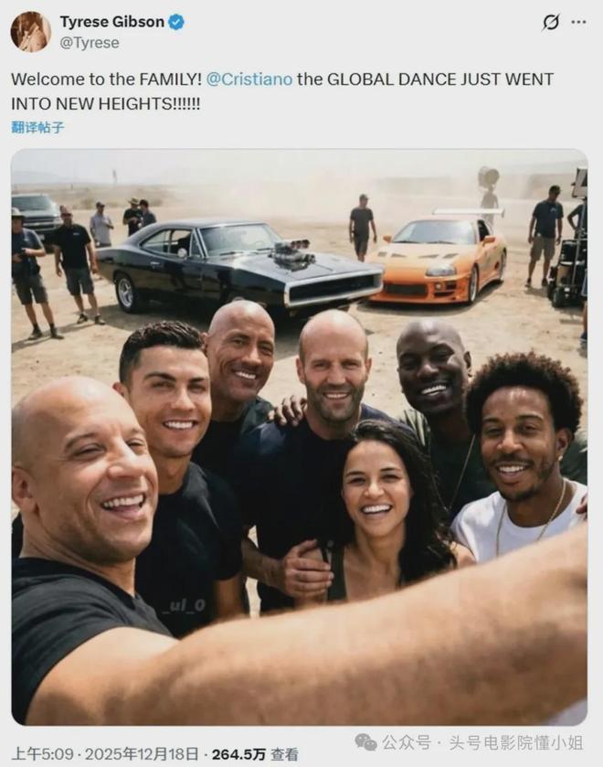 紧接着,《速激》系列的元老男星泰瑞斯·吉布森,也在社交媒体上欢迎C罗加入《速度与激情》系列,并且还上传了包含C罗的主角团合影,但这张照片是AI生成的——