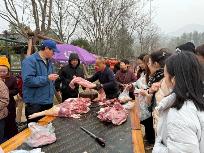 年豬宴的主角,是黃陂本地村民自養的黑豬。“這些豬都是農戶吃不完的,景區統一檢疫後屠宰,農戶可以現場賣肉,我們不收他們一分錢。”彭先生介紹,“每頭豬200斤左右,平均10多元一斤,現場能賣2000多元,賣不完的景區兜底回購。”