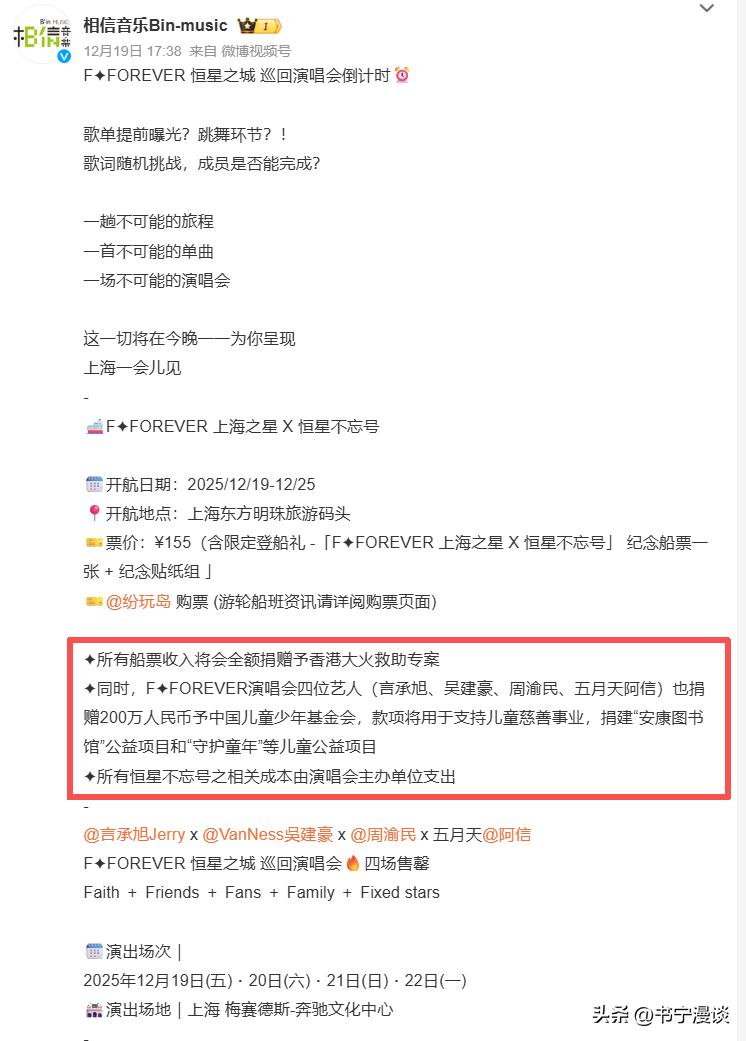 在演唱会开始前,相信娱乐发布公告,表示船票所有收入将全额捐赠予香港(专题)大火救助专案。