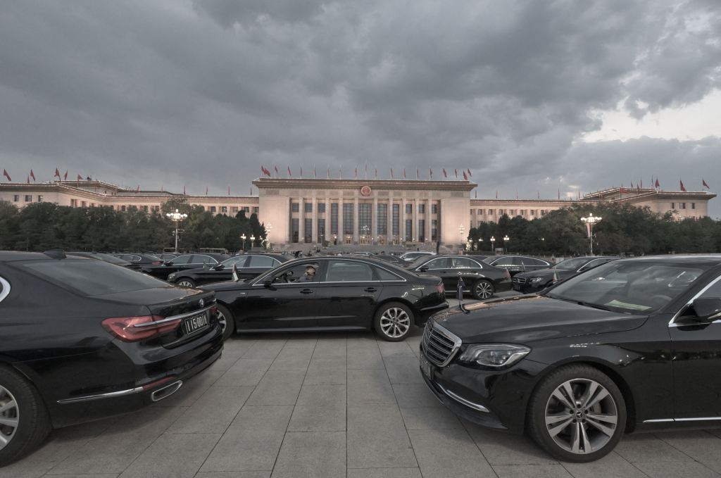 2025年9月30日,北京天安門廣場靠近人民大會堂一側密集停放的車輛。中共高官在烏雲籠罩下參加向紀念碑獻花圈活動。(Adek Berry/AFP via Getty Images)