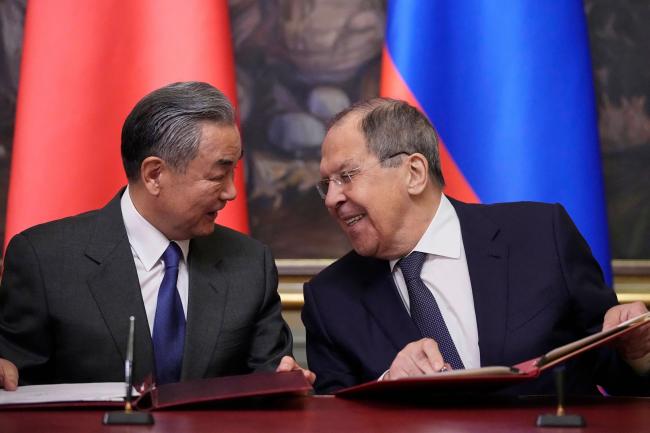 2025年4月1日,俄罗斯外长拉夫罗夫(右)和中国外长王毅在莫斯科的会谈后出席签约仪式。(美联社)